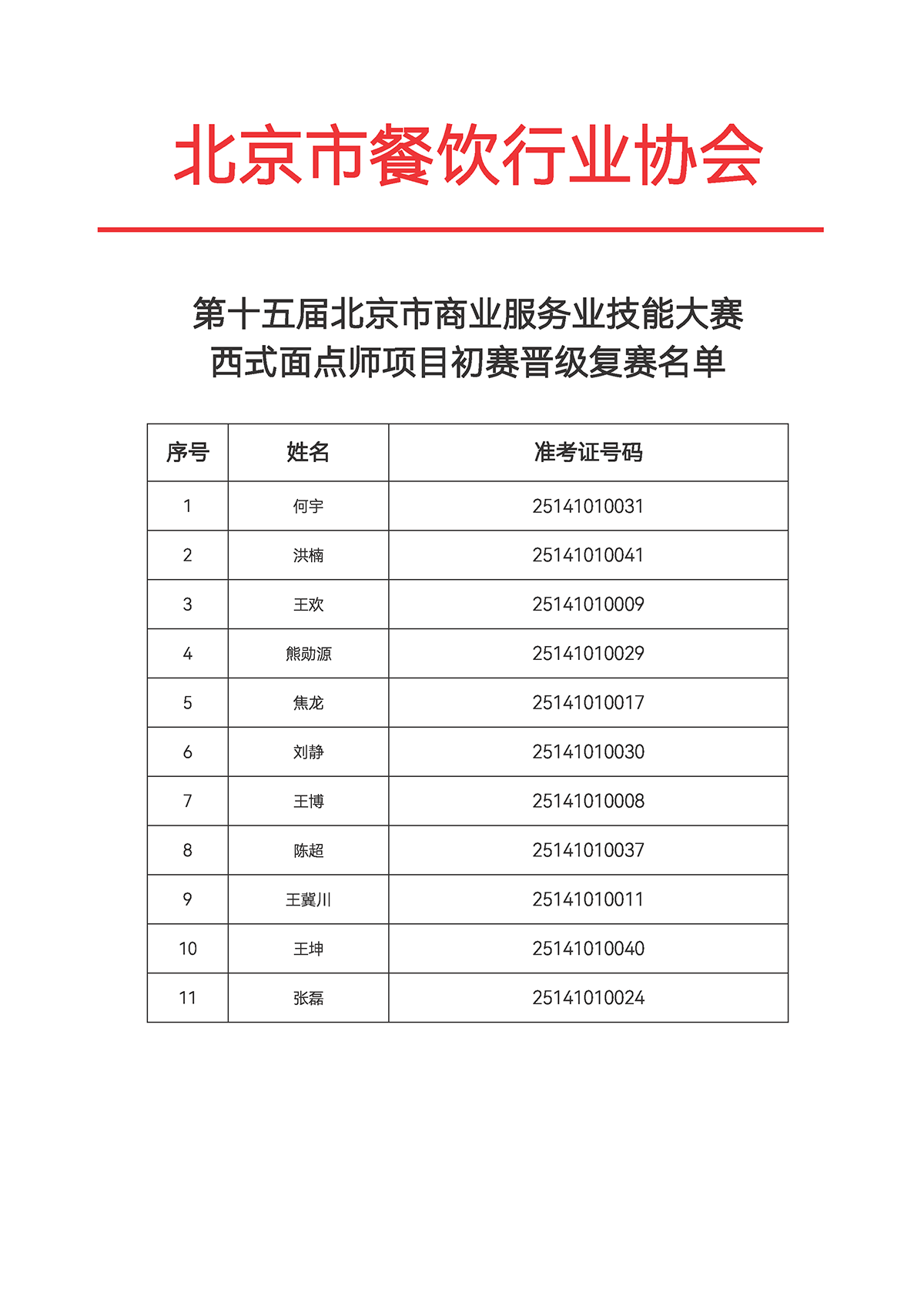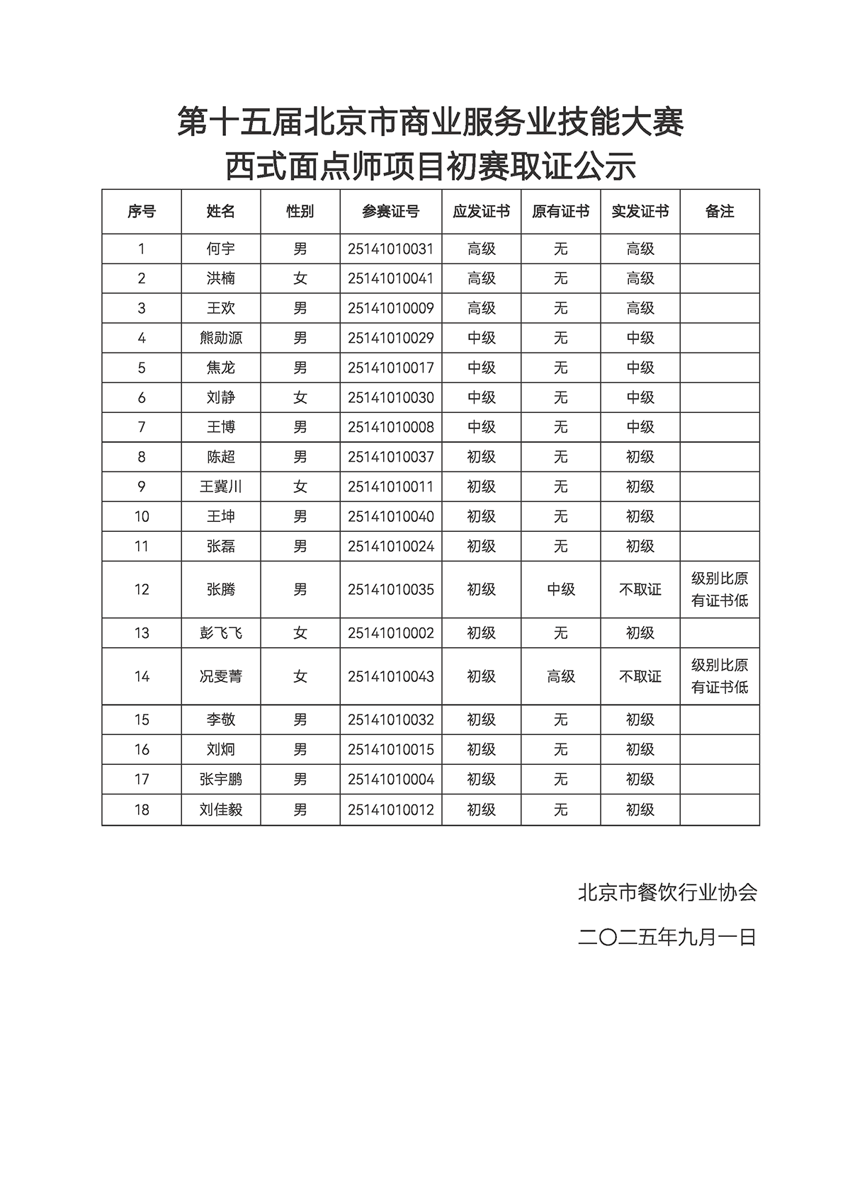 第十五届北京市商业服务业技能大赛西式面点师项目初赛晋级复赛名单